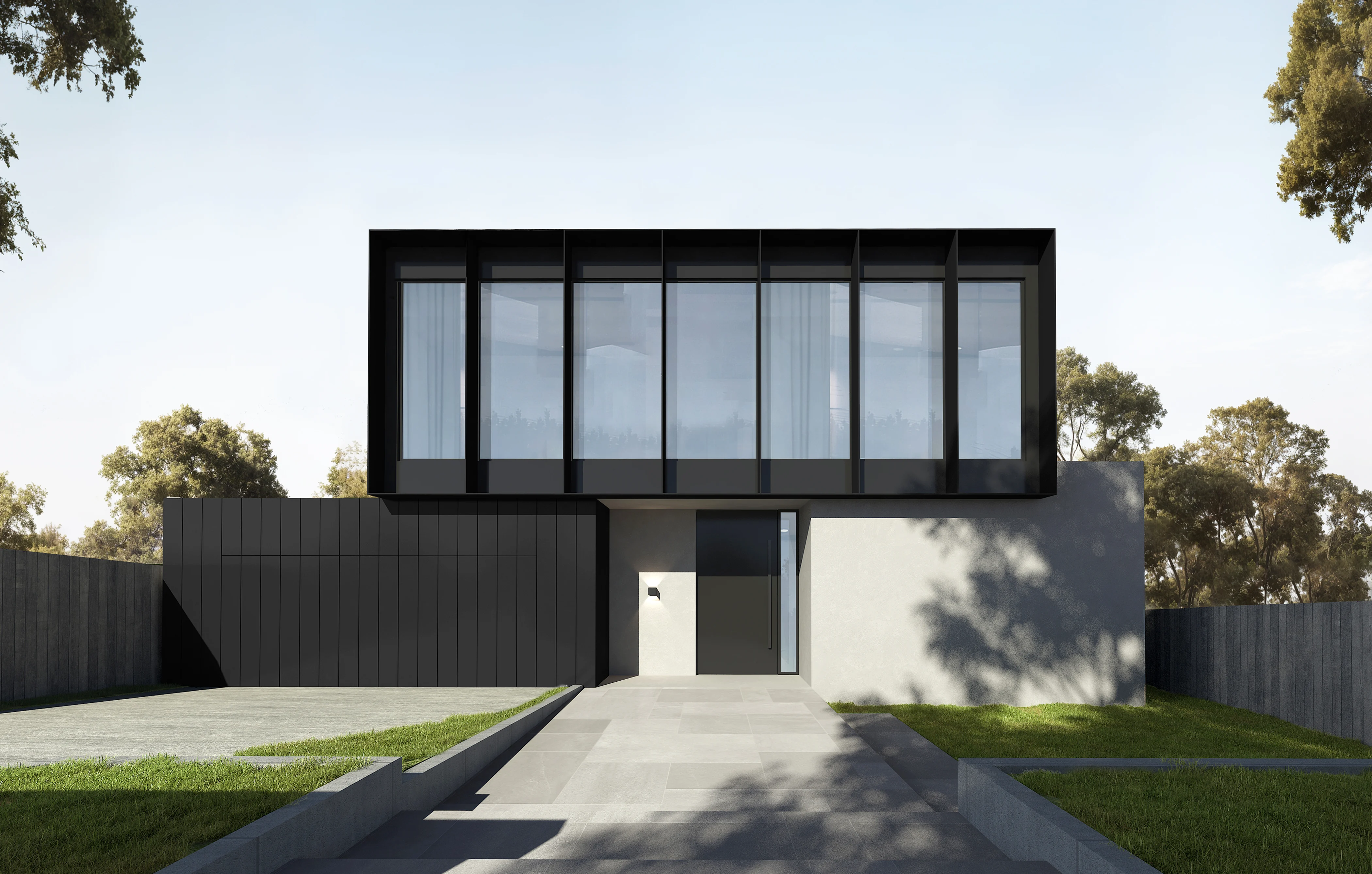 A contemporary aesthetic defines the design, featuring a monochrome façade composed of concrete and aluminium shrouds. Inside, we dramatically increased the ceiling height in the living area to enhance grandeur, brightness, and overall comfort, while also responding thoughtfully to the site’s natural downslope topography.