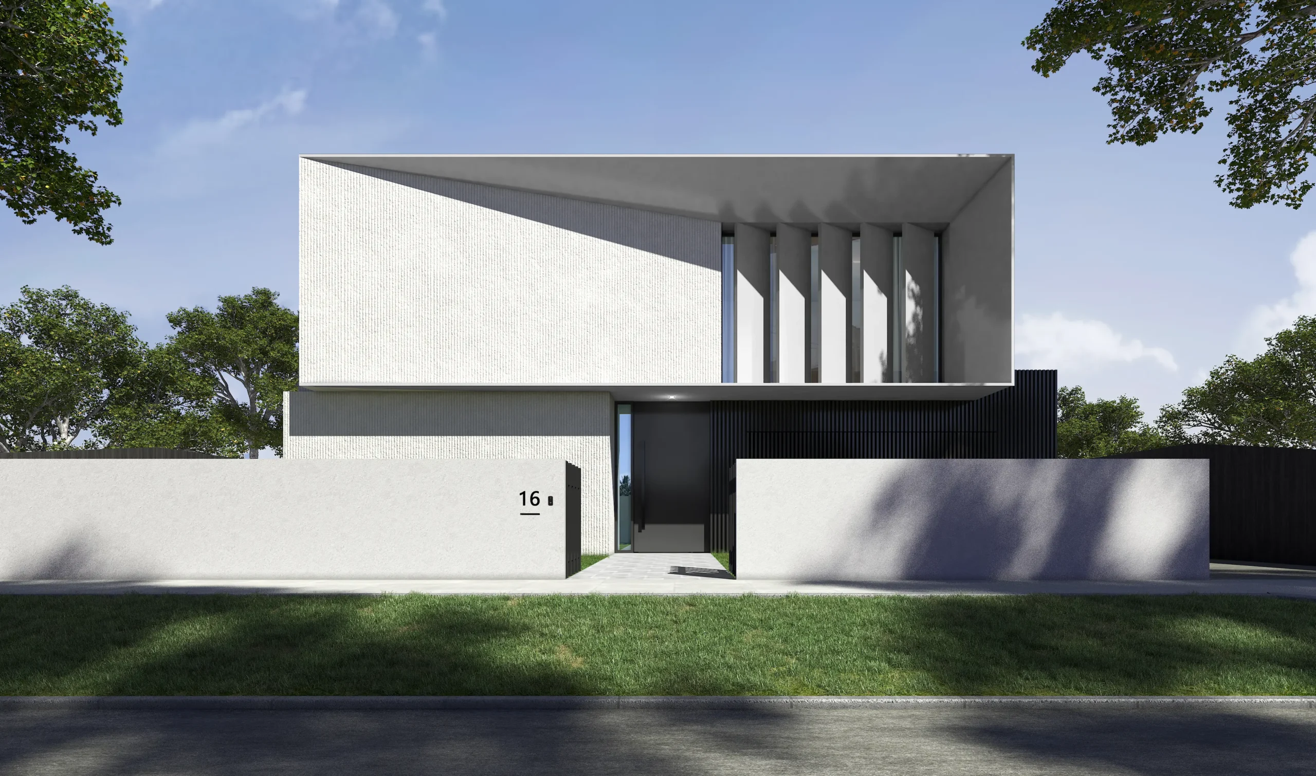 The façade is composed of natural stone cladding paired with sleek aluminium detailing, creating a textured yet streamlined appearance. While the west-facing frontage presents a more solid presence to manage afternoon sun, angled fins and carefully considered openings invite northern light deep into the interior.