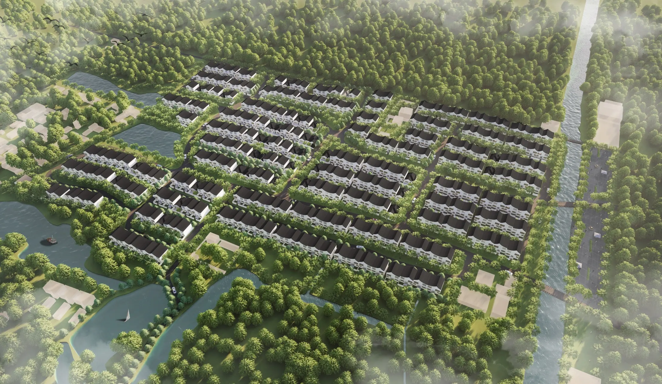 The local architectural characters are simple and elegant with traditional grey bricks and black tiles. The sloping roofs are designed to be stretched and connected, which is inspired by the nearby waterscapes and the beautiful picture of the harmonious integration of local architecture and environment.